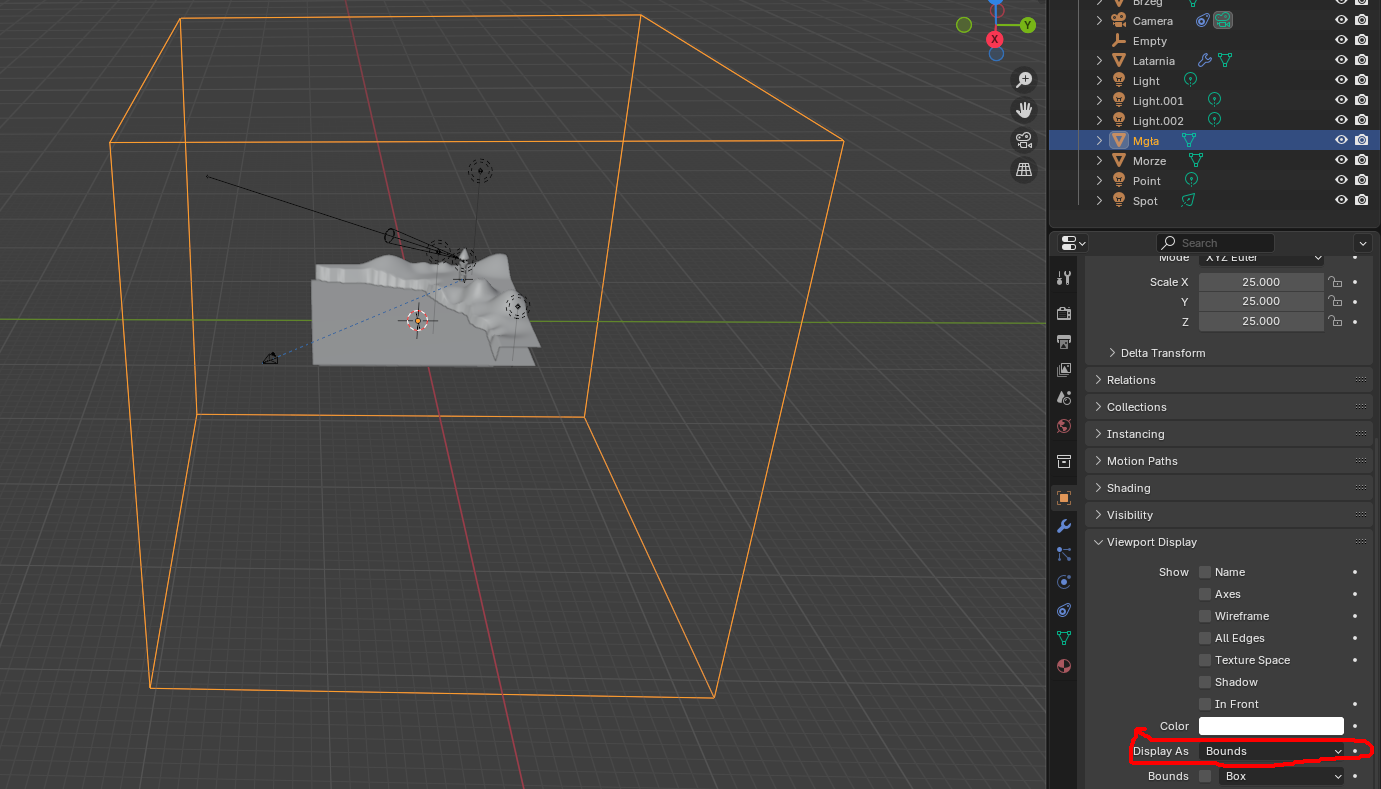 Dodaj sześcian, przeskaluj aby zawierał całą scenę. Dla wygody ustaw wyświetlenie jako Bounds.